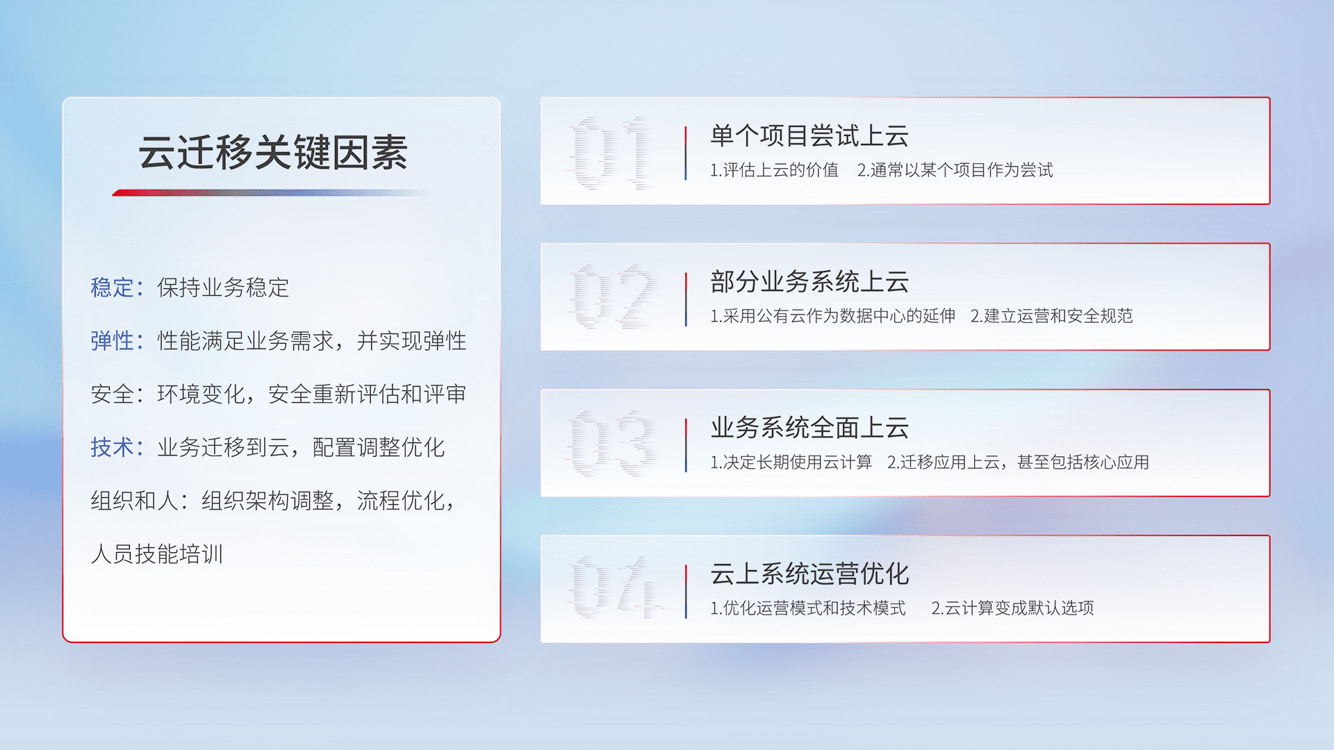结合实际业务,,,从规划设计、、、云平台选型、、、、云原生改造、、、数据迁移、、、、集成交付,,,,迁移全过程为客户识别最佳上云路径,,,做好风险识别管理,,,,设计网络架构、、身份权限、、、、安全审计合规、、操作审计、、日志审计、、、、监控告警策略、、、、多站点容灾设计等,,对云上基础设施进行整体规划,,,,提升IT治理水平,,以满足弹性、、、、高可用、、、、高性能的需求。。。