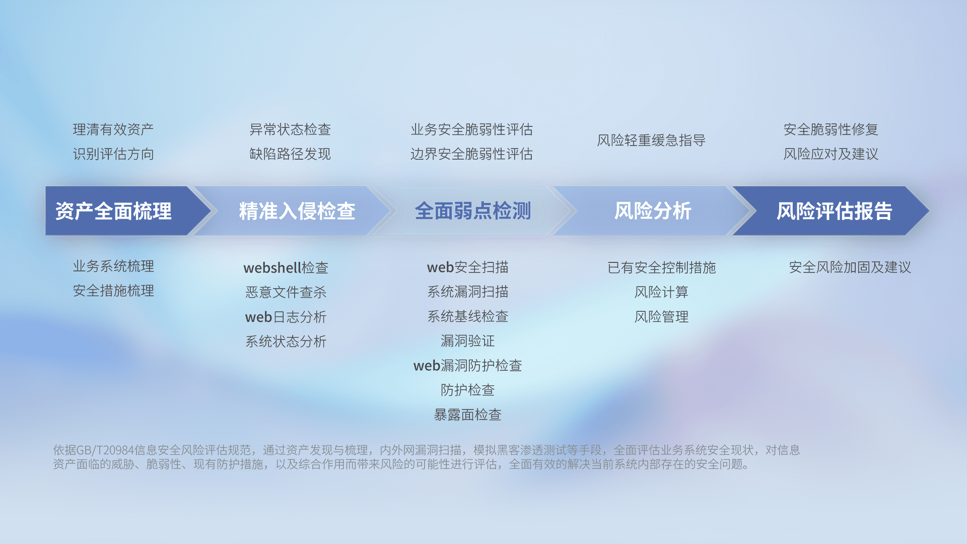 针对客户行业特性,,,,以专业的安全服务+多厂商联合解决方案提供专属的一站式安全管理服务,,,,帮助客户全面感知网络空间威胁,,,,基于识别、、、检测、、分析、、、防护、、、监测、、响应的服务理论模型,,,,从方案咨询、、、集成交付、、、、评估验证、、、优化加固、、、运维运营,,,致力于为客户提供完整的闭环管理式安全服务。。。以实战经验为客户打造高抵御风险的安全体系,,帮助客户发现威胁、、对抗威胁、、、、处置威胁,,不断积累安全对抗能力,,持续保障数字化安全。。。。